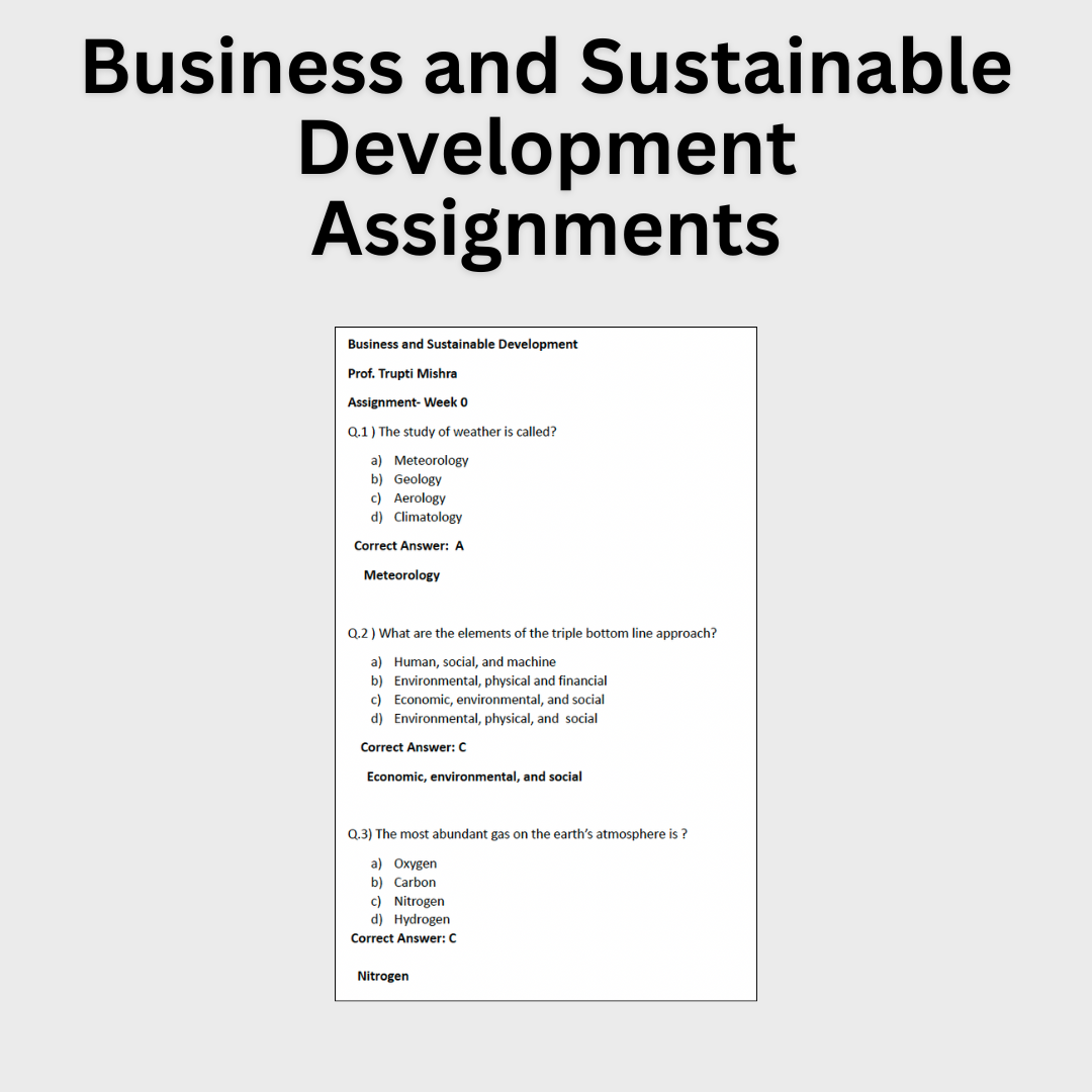 Specifically designed for the NPTEL course Business and Sustainable Development by Prof. Trupti Mishra, from IIT Bombay. Contains 50 week-wise unique questions that have been carefully compiled from the weekly quiz assignments of previous editions of the course.