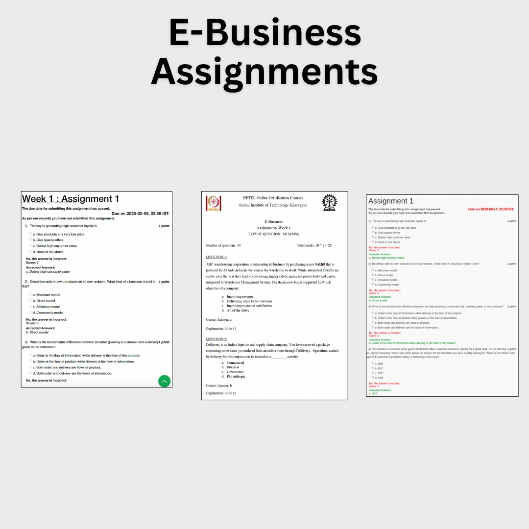 Specifically designed for the NPTEL course E-Business. Contains 120 week-wise unique questions that have been carefully compiled from the weekly quiz assignments of previous editions of the course.
