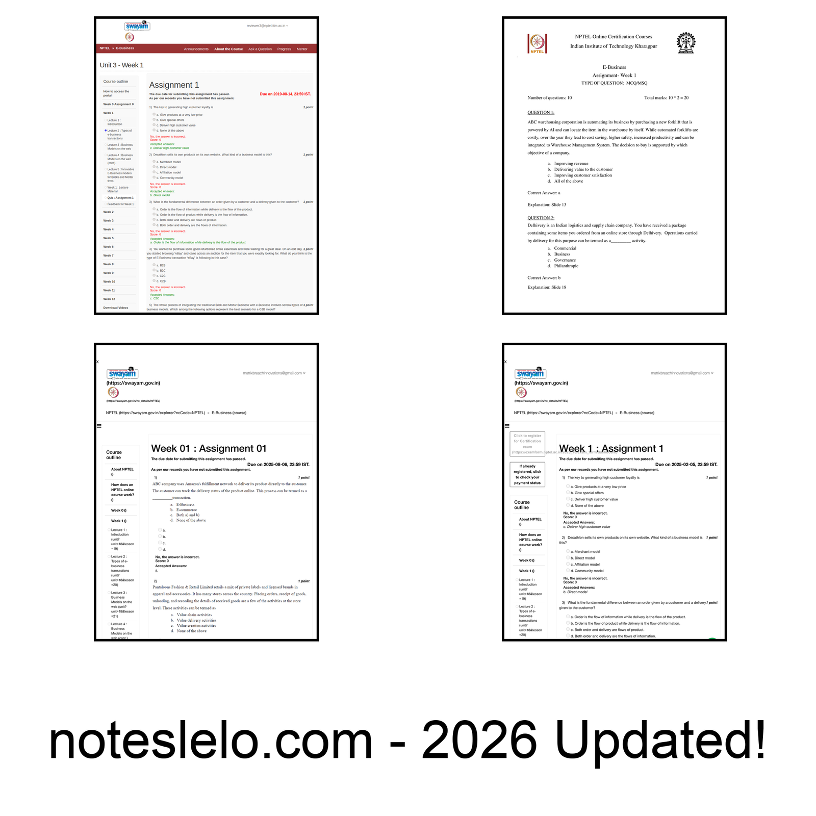 Specifically designed for the NPTEL course E-Business. Contains 120 week-wise unique questions that have been carefully compiled from the weekly quiz assignments of previous editions of the course. Download the PDFs immediately after purchase from the order completion mail or from the “Downloads” section of your profile!